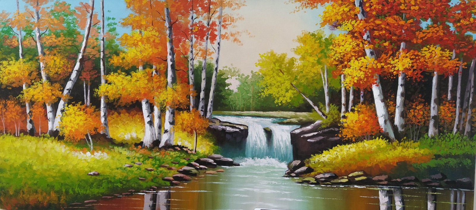 La obra nos transporta a un paisaje otoñal atravesado por un río sereno que culmina en una pequeña cascada. Los árboles de troncos blancos se elevan hacia el cielo, rodeados por una explosión de colores cálidos: amarillos, naranjas y rojos intensos que contrastan con el verde del follaje más lejano. El agua refleja la vibración del entorno, integrando luz, movimiento y calma en un mismo escenario.